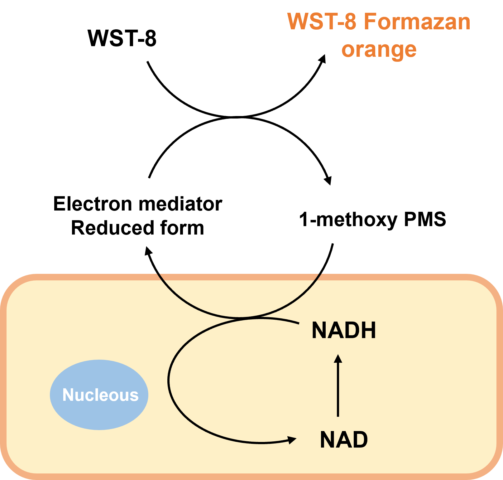 The Cell Counting Kit-8 (CCK-8) uses a water-soluble tetrazole salt WST-8 that is bioreduced in live cells to produce a methane dye. This enzymatic reduction relies on intracellular dehydrogenase activity, allowing for a direct correlation between the amount of methane produced and the number of viable cells. The water solubility of the resulting methane simplifies the assay procedure and can be quantified by a microplate reader. This kit is commonly used in biomedical research to assess cell proliferation, viability, and cytotoxicity in vitro. Compared to methods like MTT, XTT, MTS, or WST-1, CCK-8 offers increased sensitivity and ease of use.