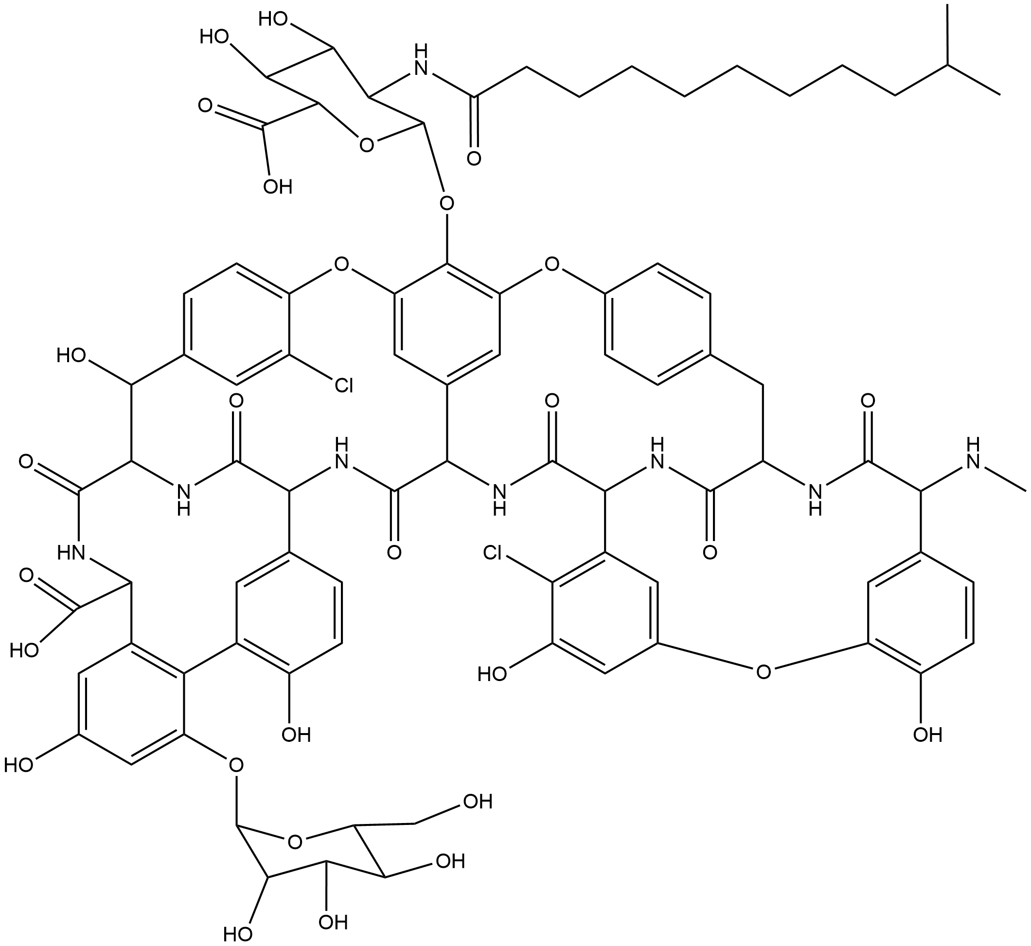 | Chemical Name | 56-(((2S,3R,4R,5S,6S)-6-carboxy-4,5-dihydroxy-3-(10-methylundecanamido)tetrahydro-2H-pyran-2-yl)oxy)-5,55-dichloro-6,11,34,40,44-pentahydroxy-15-(methylamino)-2,16,36,50,51,59-hexaoxo-42-(((2R,3S,4S,5S,6R)-3,4,5-trihydroxy-6-(hydroxymethyl)tetrahydro-2H-p |