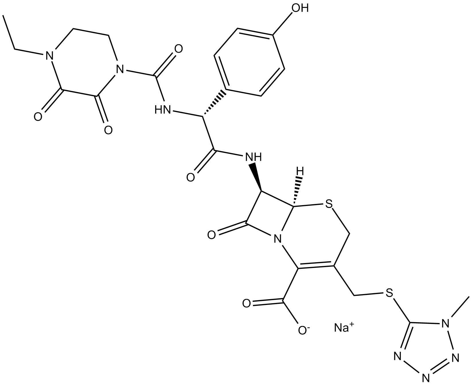 | Chemical Name | (6R,7R)-7-[[(2R)-2-[[(4-ethyl-2,3-dioxo-1-piperazinyl)carbonyl]amino]-2-(4-hydroxyphenyl)acetyl]amino]-3-[[(1-methyl-1H-tetrazol-5-yl)thio]methyl]-8-oxo-5-thia-1-azabicyclo[4.2.0]oct-2-ene-2-carboxylic acid, monosodium salt |