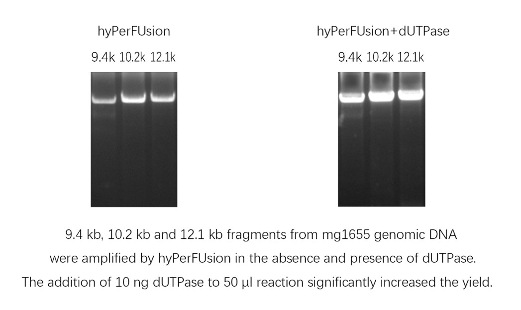 This product is an optimized formation of heat stable dUTPases that maximize high-fidelity PCR efficiency, remove contaminated dUTPs in PCR reactions and dNTP solutions, and reduce the chance of mutation. dUTPase increases the yield, length, and fidelity of PCR products, enabling further downstream applications. These effects make dUTPase useful in PCR fidelity and yield-sensitive applications, such as cloning and subsequent recombinant protein techniques, as well as gene expression analysis (semi-quantitative RT-PCR technology and real-time PCR analysis) where small differences in product accumulation can have a significant impact on gene expression analysis. dUTPase is dUTP-specific and critical to the fidelity of DNA replication and repair.