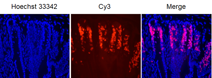 Proliferation analysis in the jejunum of C57BL/6J mice. Mice were treated with 50 mg/kg EdU (Cat# B8337) via intraperitoneal injection and sacrificed 4 hours later. Jejunum sections were stained using the EdU Imaging Kit (Cy3) (Cat# K1075).