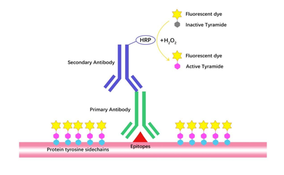Tyramide signal amplification (TSA) technology can be used to detect low-abundance targets in experiments such as tissue and cell immunofluorescence (IF), immunohistochemistry, and in situ hybridization (ISH), and can increase signal sensitivity by approximately 100-fold. Fluorescently labeled tyramine molecules are activated by HRP-labeled secondary antibodies in the presence of H2O2, triggering a large number of enzymatic reactions. This causes fluorescent molecules to bind to protein residues at the antigen-antibody binding site and in the surrounding tissue, forming extensive fluorescent deposits that achieve signal amplification. This labeling process is rapid (less than 10 minutes), and the deposited labels can be directly observed under standard or confocal microscopes. TSA fluorescence kits can also be combined with traditional immunofluorescence methods for multi-color imaging, and two or more tyramide reactions can be performed sequentially to label different targets on the same sample. Compared with conventional experiments, using TSA reagents can significantly improve signal sensitivity while maintaining stable specificity and resolution. Additionally, TSA reagents can substantially reduce the consumption of primary antibodies or probes.
