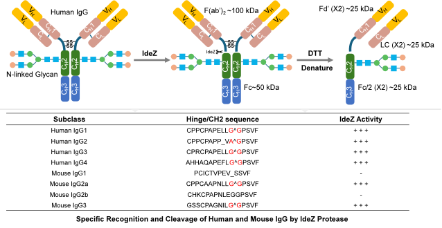 IdeZ protease (IgG-specific), also known as immunoglobulin-degrading enzyme from Streptococcus Equi subspecies zooepidemicus, also known as immunoglobulin-specific IdeZ protease, is an immunoglobulin IgG degrading enzyme (Immunoglubulin G-degrading enzyme). The protease has extremely high substrate specificity and recognizes only IgG, which is digested at a specific site in the hinge region under the antibody, hydrolyzing IgG into intact F(ab')2 and Fc fragments. IdeZ protease (IgG-specific) is mainly used as a tool enzyme for the structural characterization of antibody drugs or antibody fusion protein drugs, to prepare antibodies containing only F(ab')2 fragments or Fc fragments of antibodies, and can also be used to remove heavy chains from the interference of target protein detection during Western detection after immunoprecipitation.
