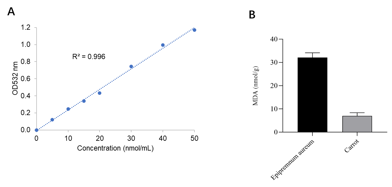 Figure 1. Typical standard curve and assay data. (A) Typical standard curve, (B) Determination of MDA levels in Epipremnum aureum and Carrot.
