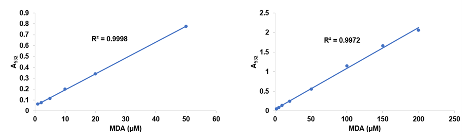 The kit provides antioxidants that can inhibit the production of new MDA in the sample during the detection process, making the detection more accurate. At the same time, the kit can detect MDA as low as 1 μM and has a good linear relationship in 1-200 μM. Compared to Lipid Peroxidation (MDA) Assay Kit (Cat. No: K2167), this kit provides an MDA lysis buffer, eliminating the need for separate purchase and offering greater convenience in use.