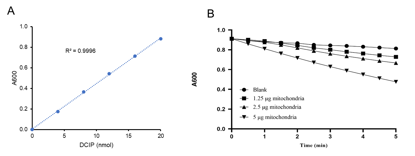Figure 1. Typical standard curve and assay data. (A) DCIP standard curve for oxidized Complex I dye, (B) the kinetic mode of varying concentrations of mitochondria