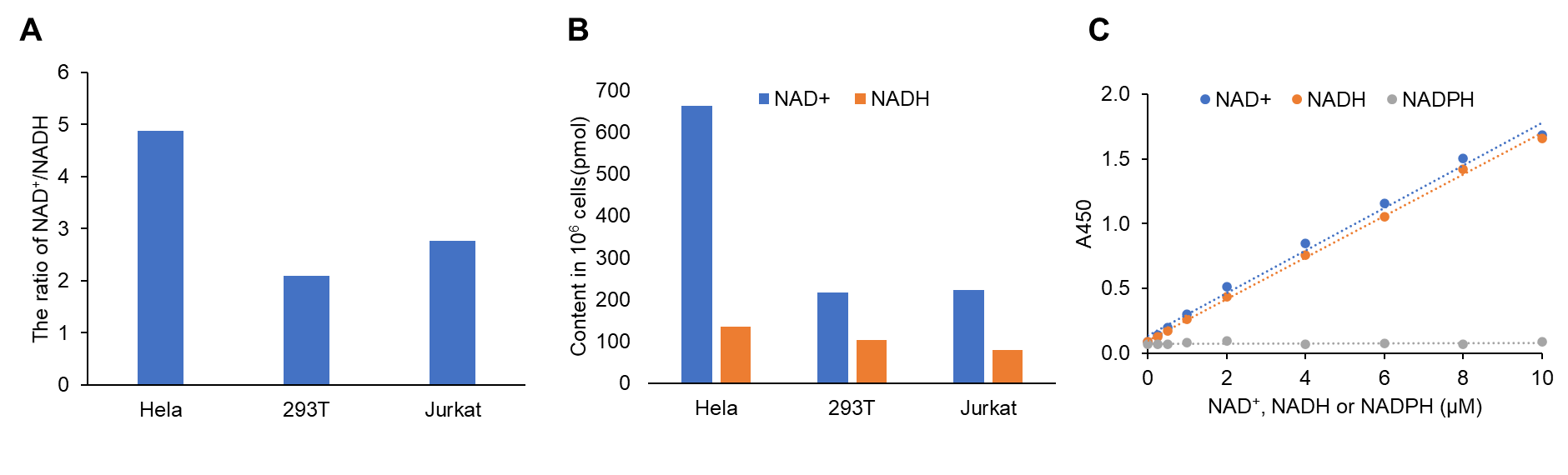 Figure 1. Typical standard curve and assay data. (A) Measure the NAD+/NADH ratio, (B) NAD+ and NADH concentration in Hela, 293T and Jurkat cells, (C) NAD+ and NADH calibration standard curves, which are not interfered with by NADPH.