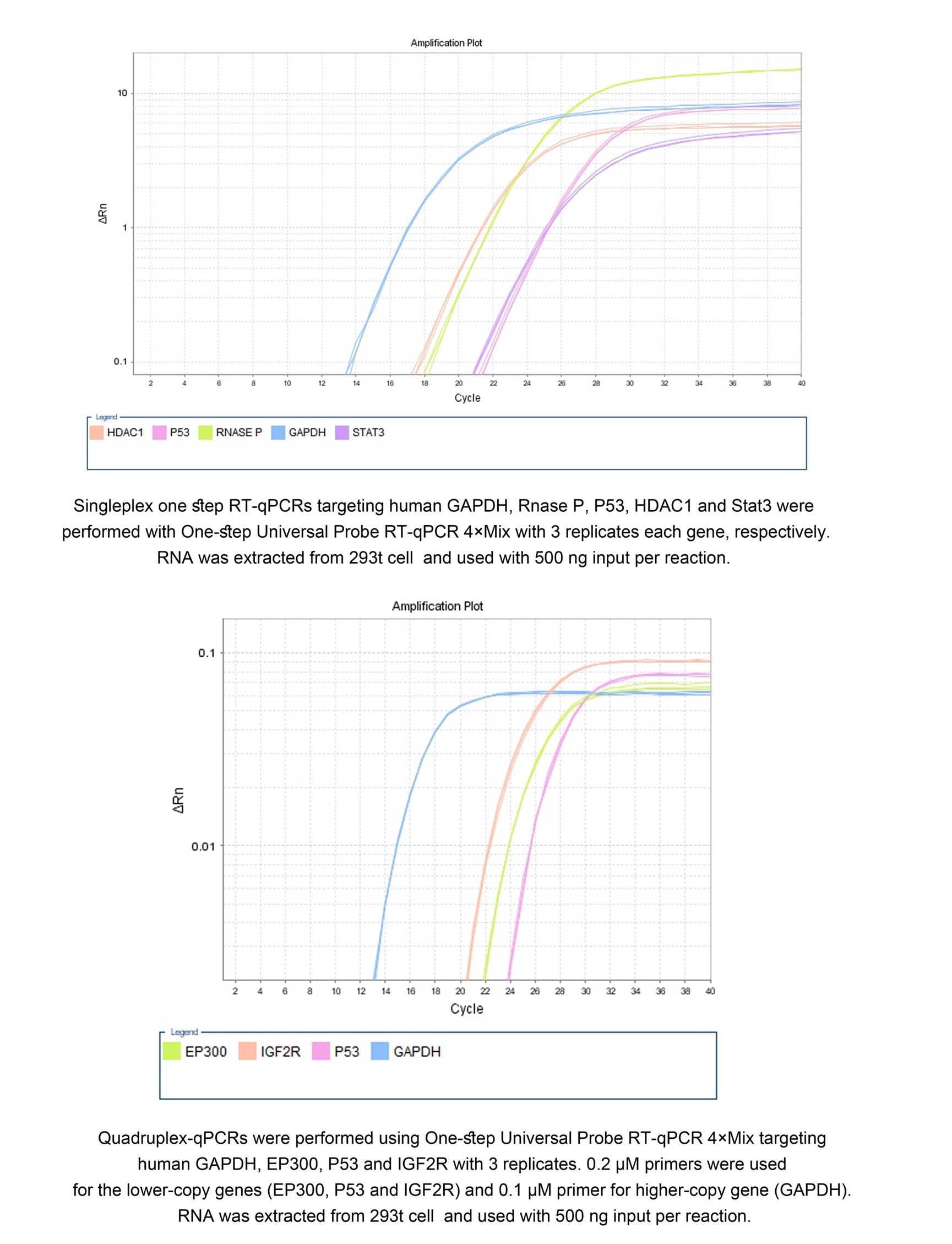 One-step Universal Probe RT-qPCR 4×Mix is a convenient 4× premix, requiring only the addition of primers, probes, and templates. It is easy to operate, compatible with fast protocols, significantly reducing detection time. It provides high accuracy and reproducibility for target gene quantification across a wide dynamic range. This product is suitable for pathogen detection, RNA virus detection, gene expression analysis, and other applications.