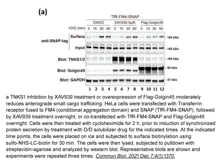 - 8. Xihua Yue, Neeraj Tiwari, et al. "Tankyrase-1-mediated degradation of Golgin45 regulates glycosyltransferase trafficking and protein glycosylation in Rab2-GTP-dependent manner." Commun Biol. 2021 Dec 7;4(1):1370. PMID: 34876695