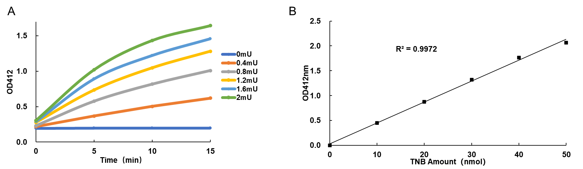 Figure 1. Typical standard curve and assay data. (A) Thioredoxin reductase Kinetic Data, (B) The reference TNB standard curve.